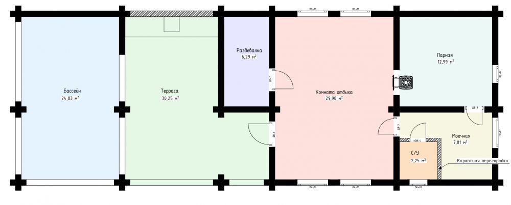Просторная двухэтажная баня из профилированного бруса, которую можно смело эксплуатировать круглогодично как загородный жилой дом или дачу. Планировка включает в себя просторную комнату отдыха, сан. узел, мойку и парную, просторное помещение свободной планировки, которое можно разделить на 2 спальни или спальню и кабинет. Большой балкон отлично подойдет для созерцания природы после банных процедур.