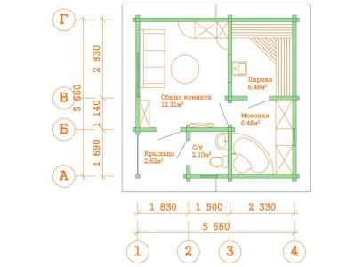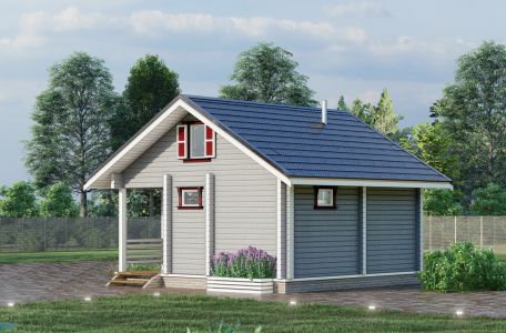 Издалека эту баню из профилированного бруса можно принять за небольшой загородный домик. Однако подойдя поближе и, конечно же, заглянув внутрь, всё встанет на свои места — это современная, экологичная, комфортабельная баня из профилированного бруса. Заслуживает особого внимания внутреннее пространство, так как там располагается, помимо парной и моечной, большая комната отдыха и даже сан. узел.