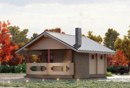 Баня из профилированного бруса с комнатой отдыха, парной и мойкой. Проектом также предусмотрено размещение зоны барбекю на террасе. Архитектурно баня близка к стилю «Шале», который включает в себя большие свесы кровли, видимые балки и консоли, поэтому идеально впишется в горную местность рядом с домом-шале.