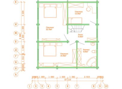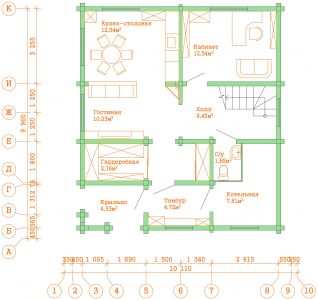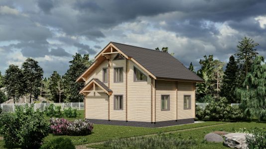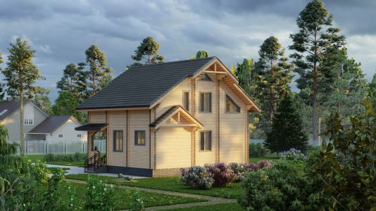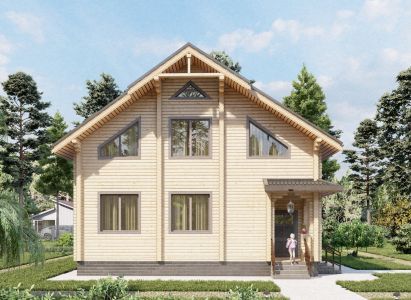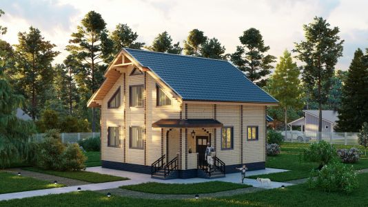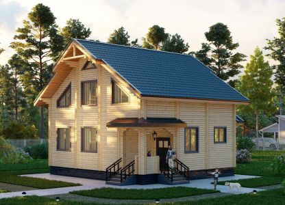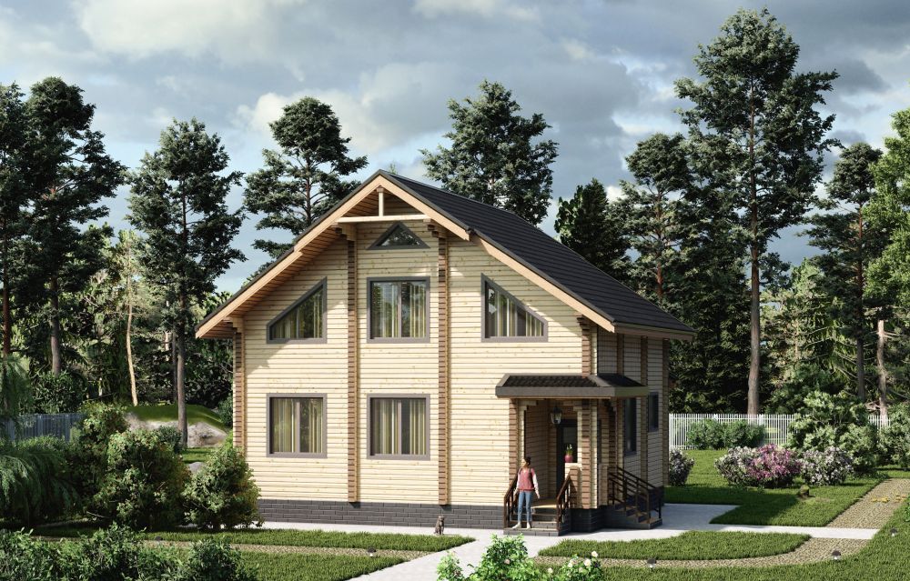 Современный двухэтажный дом из профилированного бруса. Из-за своей огромной площади и статности его можно вполне величать как «Замок из профилированного бруса». Двустороннее крыльцо на углу дома элегантно вписывается в дизайн и являет собой начало пути в вереницу просторных комнат и залов этого дома из бруса. Свет и уют — вот, что характеризует пространства этого замечательного дома. Ну и, конечно же, внутреннему убранству не уступает прочный и стильный фасад здания.