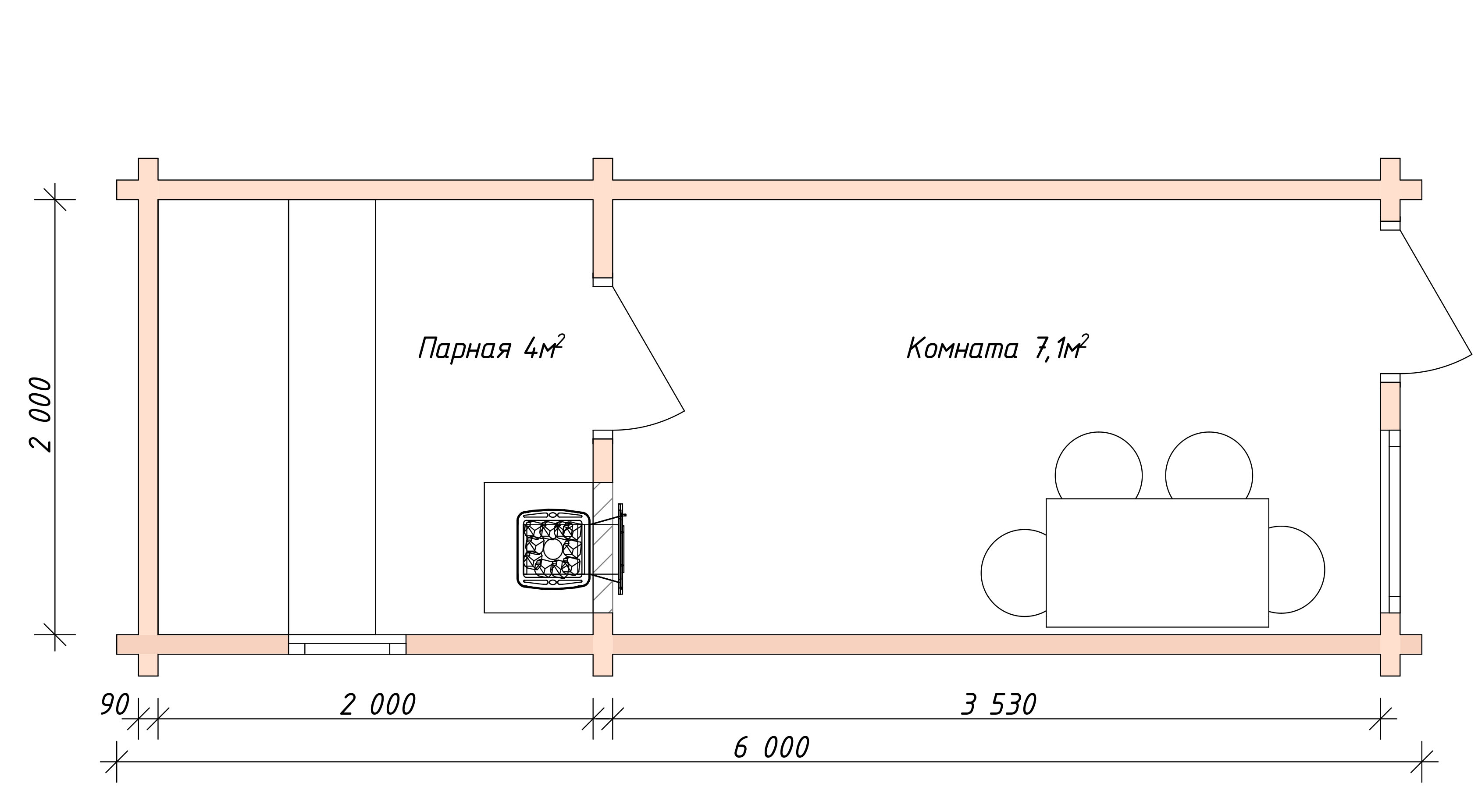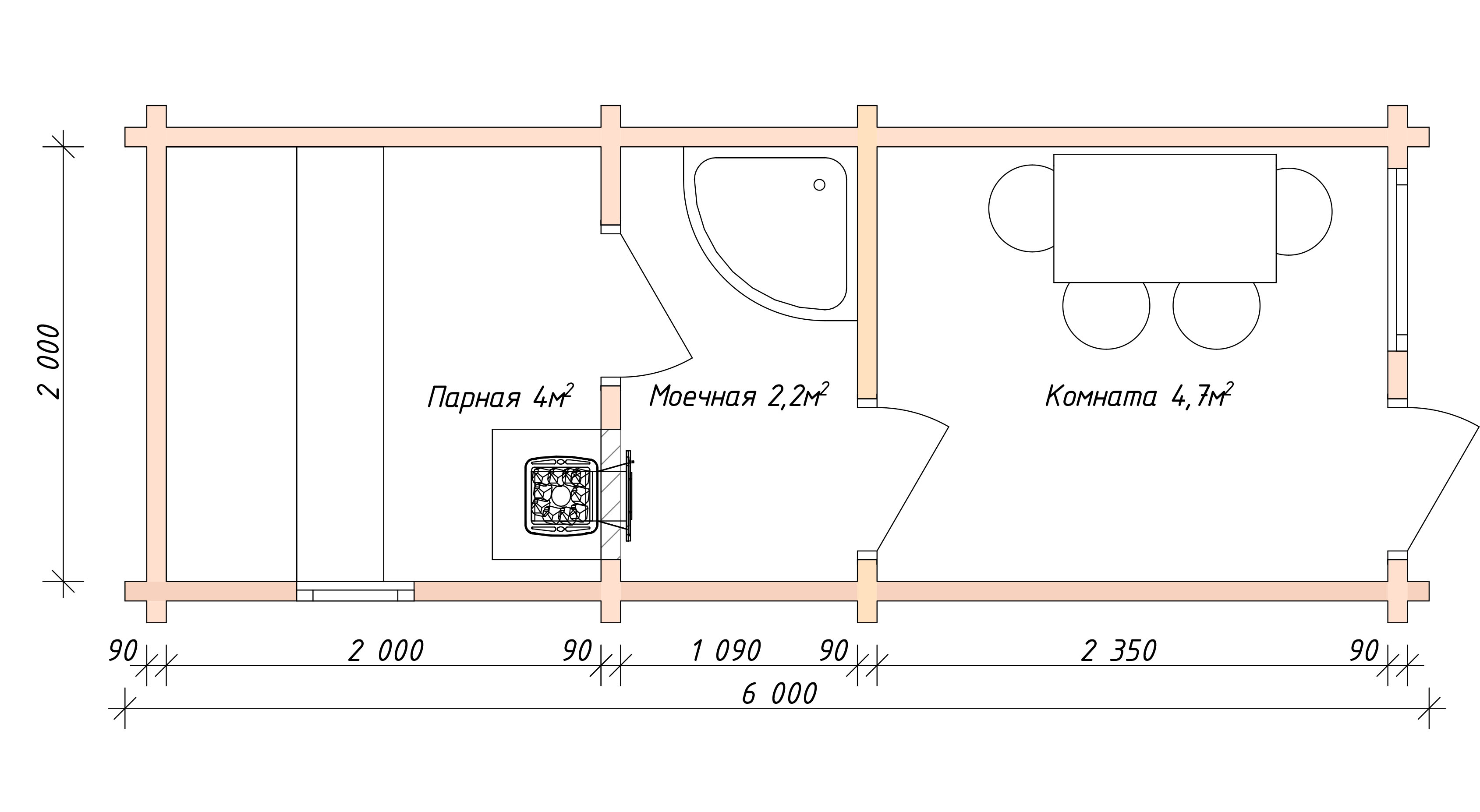 Стены | Сухой профилированный брус 90*h140 мм. Материал — Ангарская Сосна. Между рядами сруба проложен утеплитель — термолен. Не требует дополнительной отделки и утепления! Подходит для межсезонья! |